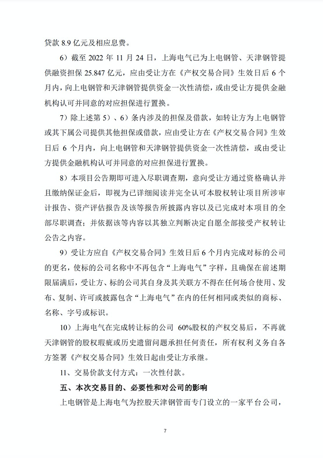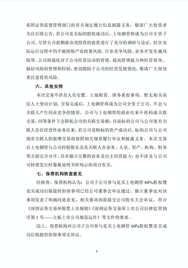上電鋼管是上海電氣為控股天津鋼管而專門設立的一家平臺公司,其持有的核心資產為所持天津鋼管51.02%股權。天津鋼管承繼了天津鋼管集團股份有限公司原350萬噸無縫鋼管產能相關的核心資產。天津鋼管是目前國內規模領先、品種規格齊全的石油套管生產企業,在國際市場上能與全球領先的無縫鋼管企業并駕齊驅,享有極高的國際品牌認可度和知名度。為完善戰略布局、謀求長足發展,2021年中信特鋼(以下簡稱“公司”)子公司科創特鋼競購了上電鋼管40%的股權,上海電氣和公司子公司科創特鋼分別持有上電鋼管60%和40%的股權。公司擬通過全資子公司為參與競買主體,以自有及自籌資金參與本次交易的競買程序,若公司此次成功競得上電鋼管60%股權,上電鋼管將成為公司的全資子公司,有利于公司進一步 鞏固及發展無縫鋼管市場,提升公司在市場上的整體競爭力。