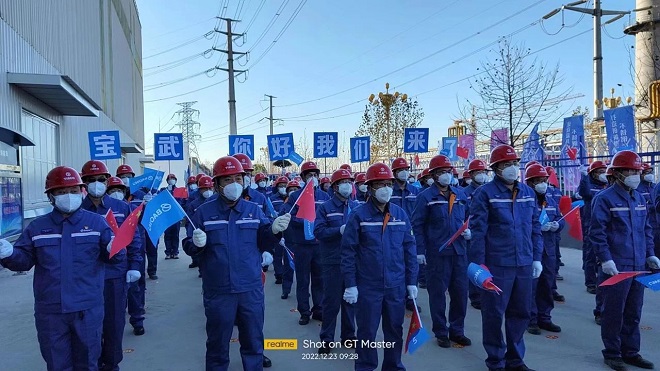 儀式現(xiàn)場(chǎng),干部職工士氣高昂,整裝待發(fā)。9時(shí)5分,總經(jīng)理、黨委副書(shū)記胡望明宣布“山東太鋼鑫海不銹鋼有限公司煉鋼項(xiàng)目正式投產(chǎn)!”現(xiàn)場(chǎng)掌聲陣陣,出席現(xiàn)場(chǎng)儀式的領(lǐng)導(dǎo)共同按下項(xiàng)目啟動(dòng)按鈕,在場(chǎng)職工齊聲高呼“寶武你好,我們來(lái)了!”將公司日的喜慶氣氛推向高潮。