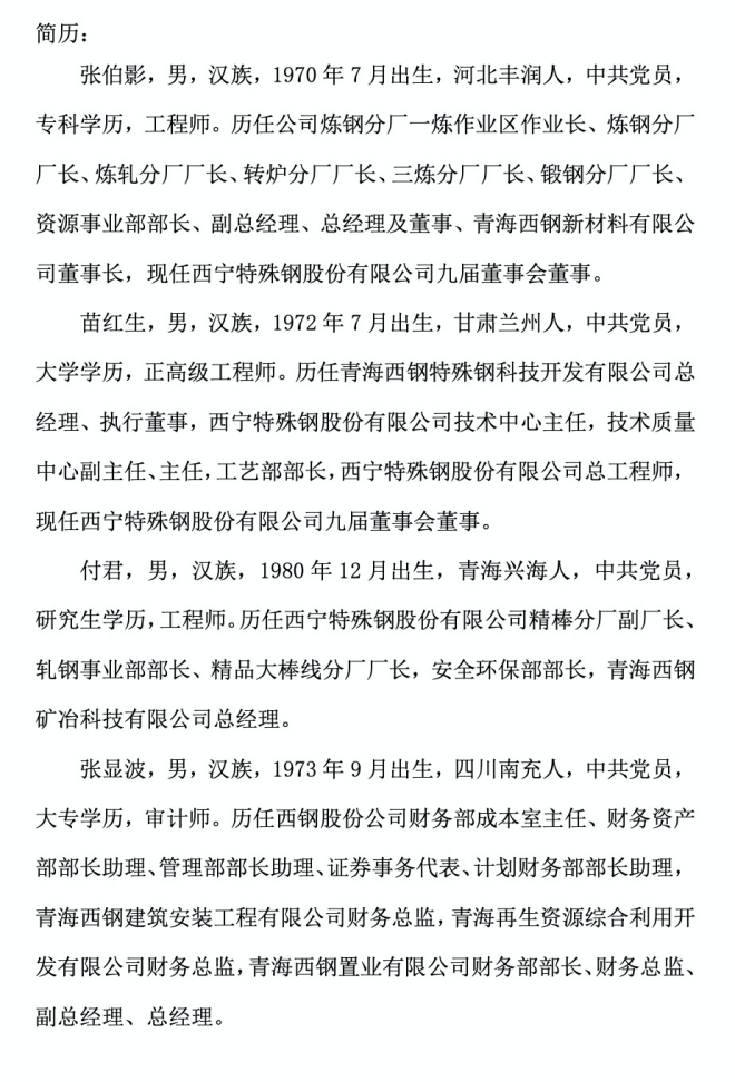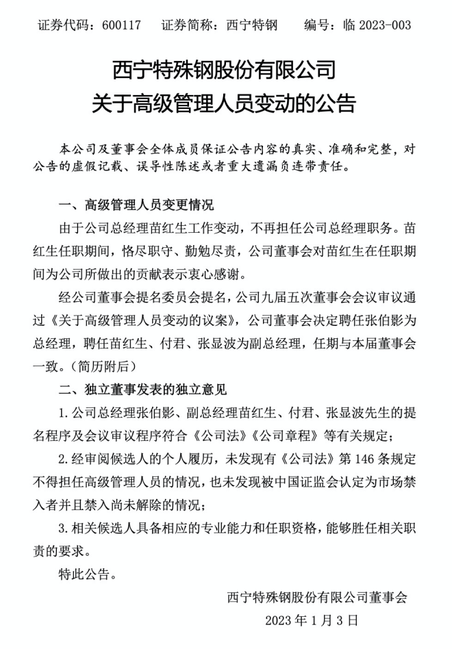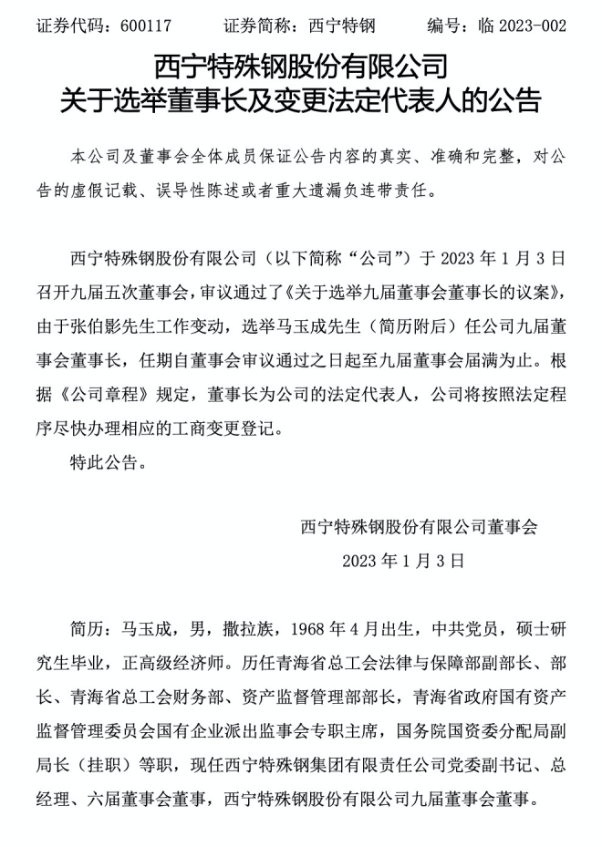 從《公告》中獲悉,西寧特殊鋼股份有限公司(以下簡稱“公司”)于2023年1月3日召開九屆五次董事會,審議通過了《關于選舉九屆董事會董事長的議案》和《關于高級管理人員變動的議案》,由于張伯影先生工作變動,選舉馬玉成先生任公司九屆董事會董事長,任期自董事會審議通過之日起至九屆董事會屆滿為止。由于公司總經理苗紅生工作變動,不再擔任公司總經理職務。公司董事會決定聘任張伯影為總經理,聘任苗紅生、付君、張顯波為副總經理,任期與本屆董事會一致。