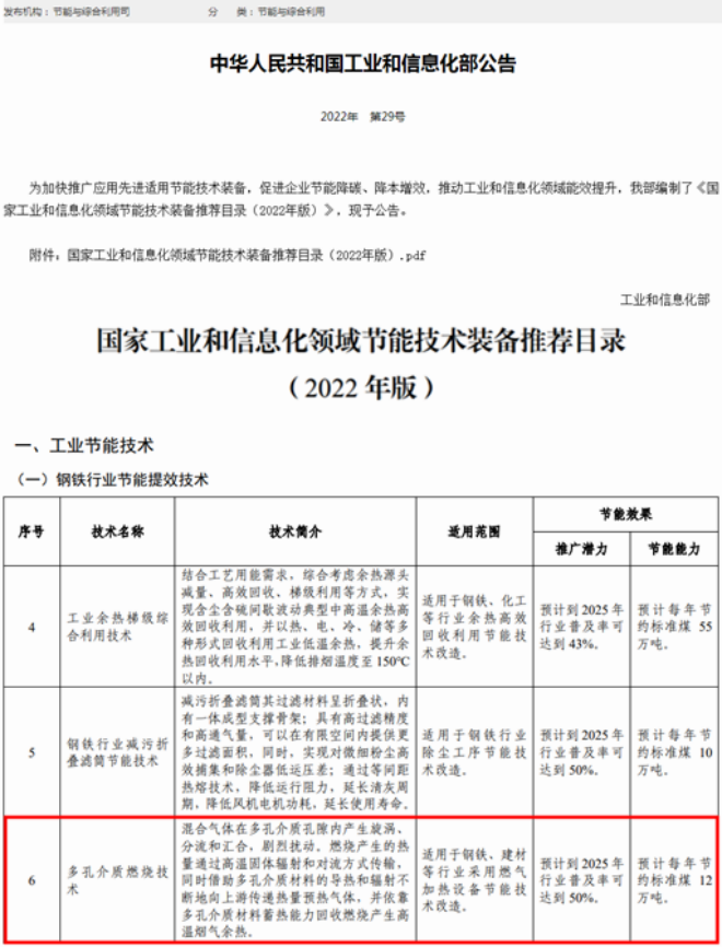 近日,中冶南方熱工公司“多孔介質(zhì)燃燒技術(shù)”通過地方審核推薦、行業(yè)協(xié)會及中央企業(yè)推薦、工信部專家評審等環(huán)節(jié)層層篩選,經(jīng)社會公示后,成功入選《國家工業(yè)和信息化領(lǐng)域節(jié)能技術(shù)裝備推薦目錄(2022年版)》。