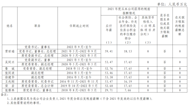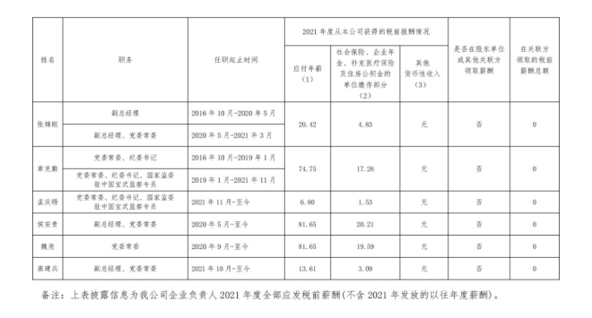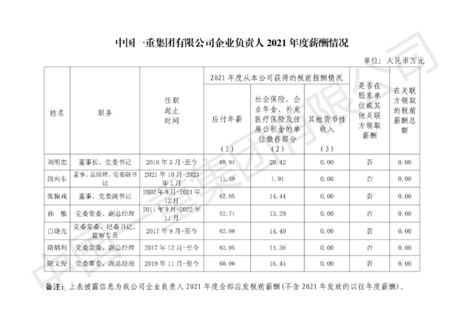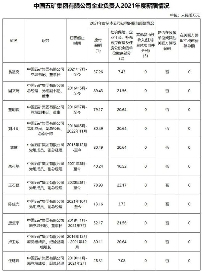 備注:上表披露信息為中國五礦企業負責人2021年度全部應發稅前薪酬(不含2021年發放的以往年度薪酬)。