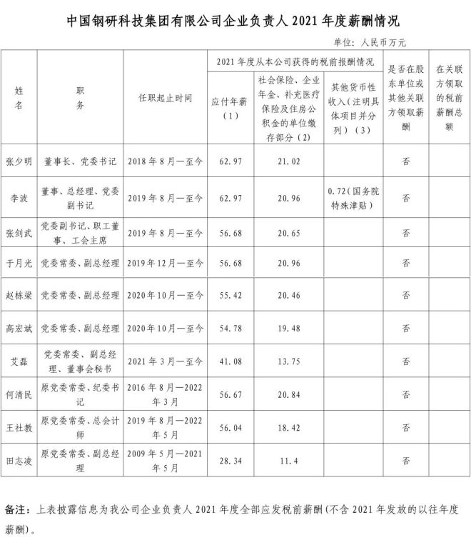 近日,中國一重、鞍鋼集團、中國寶武、中國五礦、中國鋼研、新興際華等央企披露了企業負責人2021年度薪酬情況,中國冶金報—中國鋼鐵新聞網小編匯總如下:
