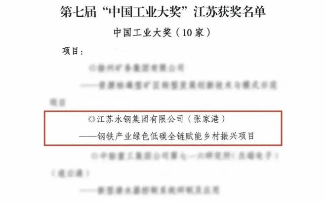日前,中國工業經濟聯合會發布第七屆“中國工業大獎”獲獎名單,永卓控股有限公司“鋼鐵產業綠色低碳全鏈賦能鄉村振興項目”位列其中。“中國工業大獎”是經國務院批準設立的我國工業領域的最高獎項,截至目前,江蘇省僅有28個企業或項目得到過該項表彰。