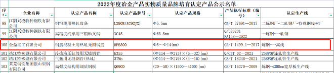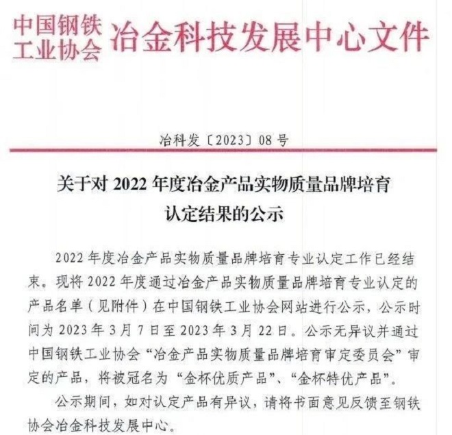 近日,中國(guó)鋼鐵工業(yè)協(xié)會(huì)發(fā)布2022年度冶金產(chǎn)品實(shí)物質(zhì)量品牌培育認(rèn)定結(jié)果的公示,金鼎申報(bào)的鋼筋混凝土用熱軋光圓鋼筋HPB300(線材)產(chǎn)品被冠名為“金杯優(yōu)質(zhì)產(chǎn)品”!