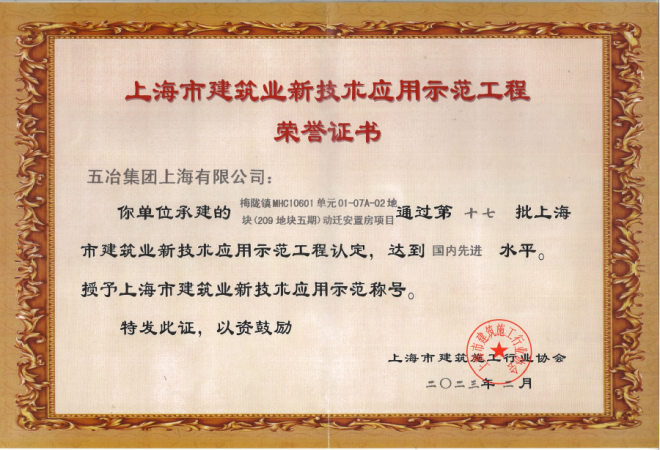 2023年3月20日,上海市建筑施工行業(yè)協(xié)會(huì)正式公示了2022年下半年度建筑業(yè)新技術(shù)應(yīng)用示范工程成果的評(píng)定結(jié)果,中國五冶集團(tuán)梅隴209五期動(dòng)遷安置房項(xiàng)目新技術(shù)應(yīng)用達(dá)到國內(nèi)先進(jìn)水平,榮獲第十七批“上海市建筑業(yè)新技術(shù)應(yīng)用示范工程”稱號(hào)。