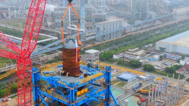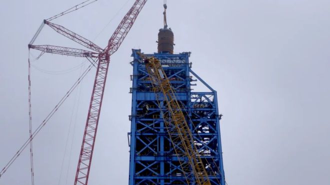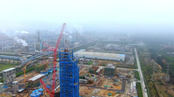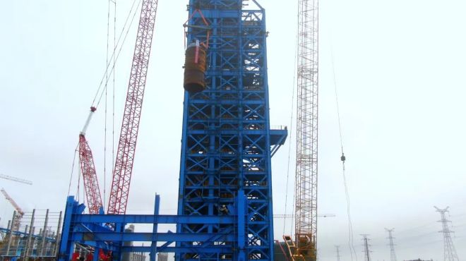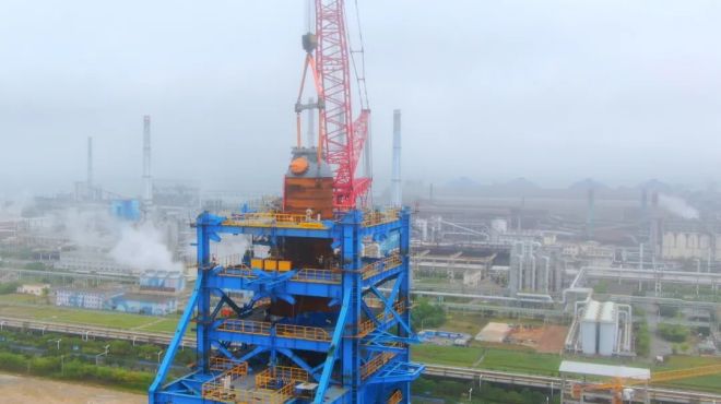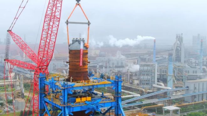 氫基豎爐本體爐殼分5段,第一段于2022年12月23日吊裝完成,第二、三、四段于今年3月中下旬吊裝完成,本次吊裝的第五段爐殼是最后一段爐殼,高約12.6米,重約78.5噸。