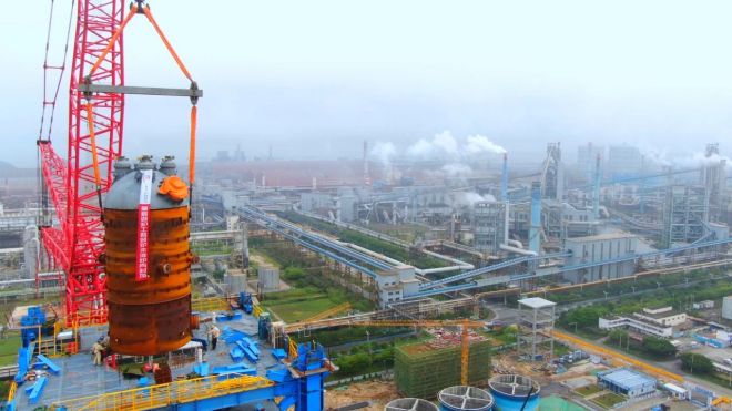4月1日上午10點(diǎn)08分,國(guó)內(nèi)首座百萬噸級(jí)氫基豎爐最后一段爐殼開始吊裝,經(jīng)過900噸級(jí)履帶吊1個(gè)小時(shí)的吊運(yùn),該段爐殼抵達(dá)豎爐塔82.3米高度位置,成功吊裝到位,這標(biāo)志著寶鋼股份湛江鋼鐵氫基豎爐爐殼全部順利吊裝完成,氫基豎爐工程建設(shè)進(jìn)入爐頂結(jié)構(gòu)安裝高峰期。
