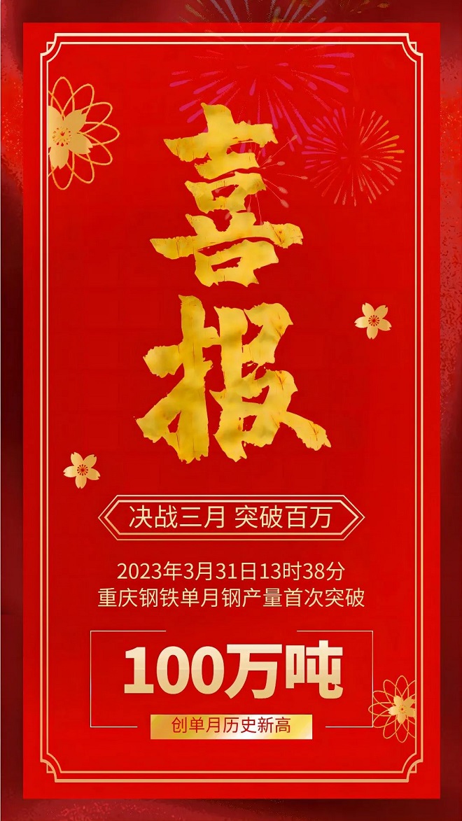 2023年是重慶鋼鐵全力沖刺超千萬噸,實現跨越式發展的攻堅之年。在中國寶武、中南鋼鐵的堅強領導下,重慶鋼鐵以黨政“1366”,實現“1111”目標為統攬,以制造能力提升、基礎管理能力和人事效率提升為抓手,突破生產難點、瓶頸,全體員工以“不破樓蘭終不還”的決心和勇氣,以“一天也不能耽誤,一天也不能懈怠”的精神狀態,團結成“一塊堅硬的鋼鐵”,全力推進高效穩定生產,3月鋼產量100萬噸,首次突破百萬大關,創月產鋼新紀錄。