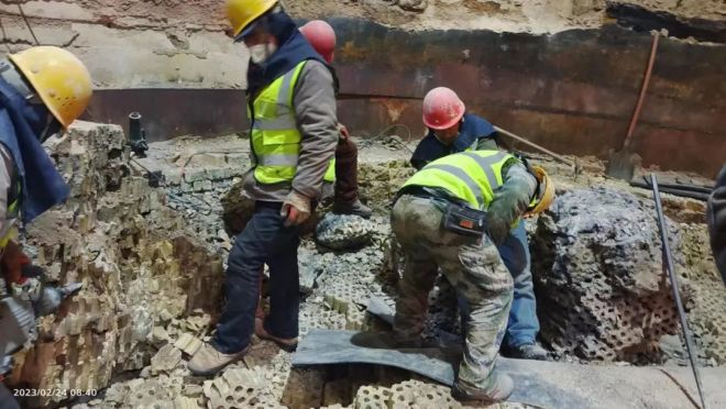 豫興公司技術團隊進熱風爐內查看后發現,蓄熱體格子磚床面已全部被粉塵及渣蝕堵塞,上部高溫區域格子磚板結為一體,板結厚度約1.5米,且格子磚床面下沉約2米;支撐拱頂直段的托板及內層爐殼已經嚴重碳化損壞成分層狀和粉末狀,存在極大的安全隱患,不言自明!