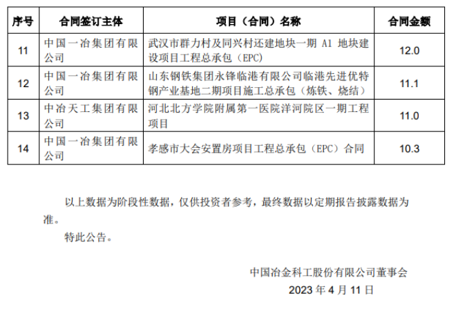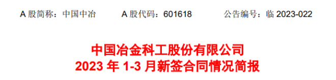 4月12日,中國中冶發布了《中國冶金科工股份有限公司 2023 年 1-3 月新簽合同情況簡報》(以下簡稱《簡報》)。