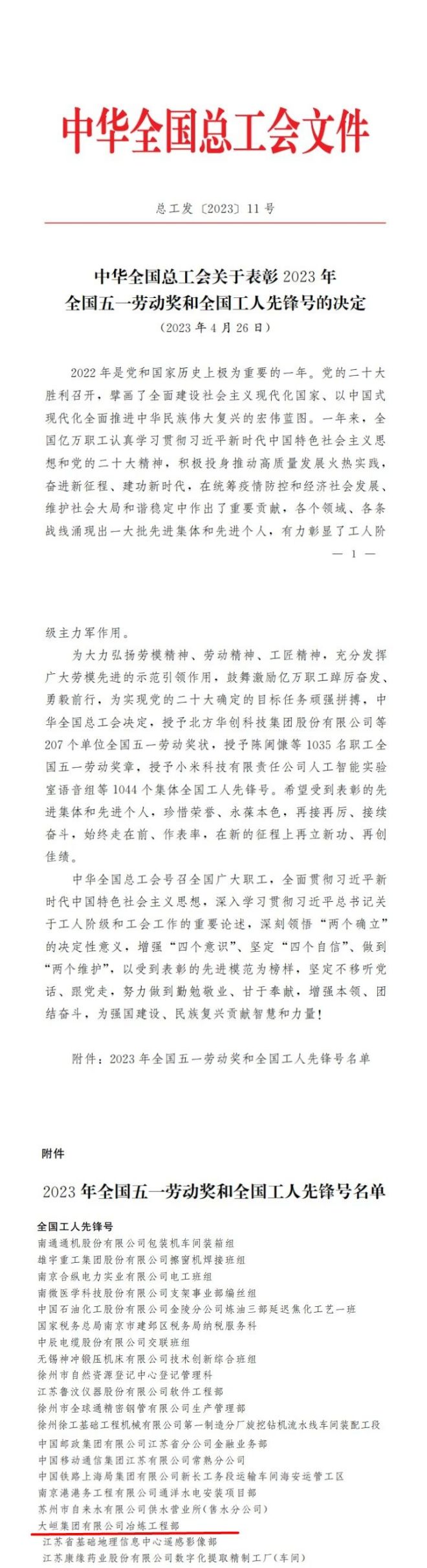 “全國工人先鋒號”是中華全國總工會設立的、以創一流工作、一流服務、一流業績、一流團隊為核心內容的最高榮譽稱號,每年評選一次。授予對象是:全國各類企事業單位中為推動經濟社會發展做出突出貢獻,并具有時代性、先進性和示范性的單位或集體。