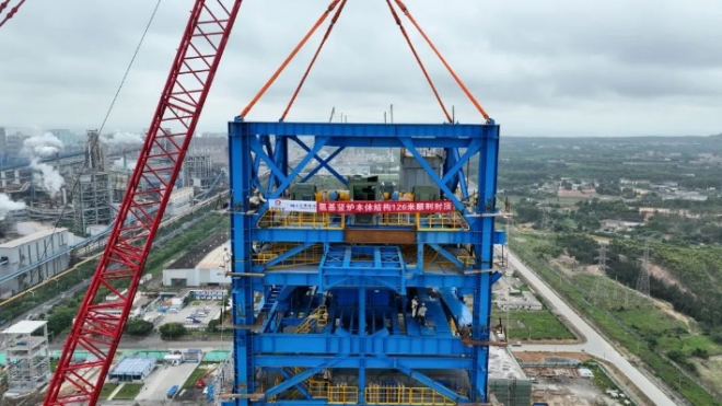 4月27日06:28,寶鋼股份湛江鋼鐵國內首座百萬噸級氫基豎爐塔頂最后一段鋼結構開始吊裝,歷時1個多小時的吊運,順利抵達豎爐塔121.1m高度位置并成功吊裝到位,標志著寶鋼股份湛江鋼鐵氫基豎爐126m本體鋼結構順利封頂。