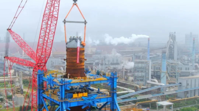 氫基豎爐本體爐殼分5段,第一段于2022年12月23日吊裝完成,第二、三、四段于今年3月中下旬吊裝完成,本次吊裝的第五段爐殼是最后一段爐殼,高約12.6m,重約78.5噸。