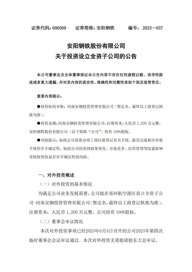 安陽鋼鐵:擬出資1200萬元設立投資管理公司
