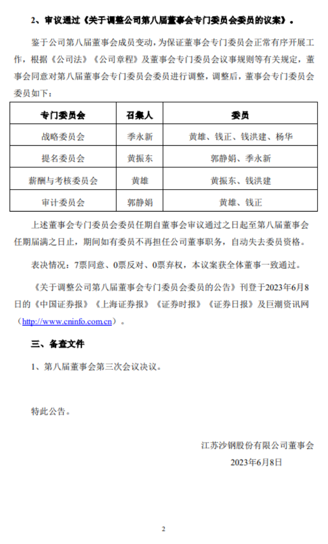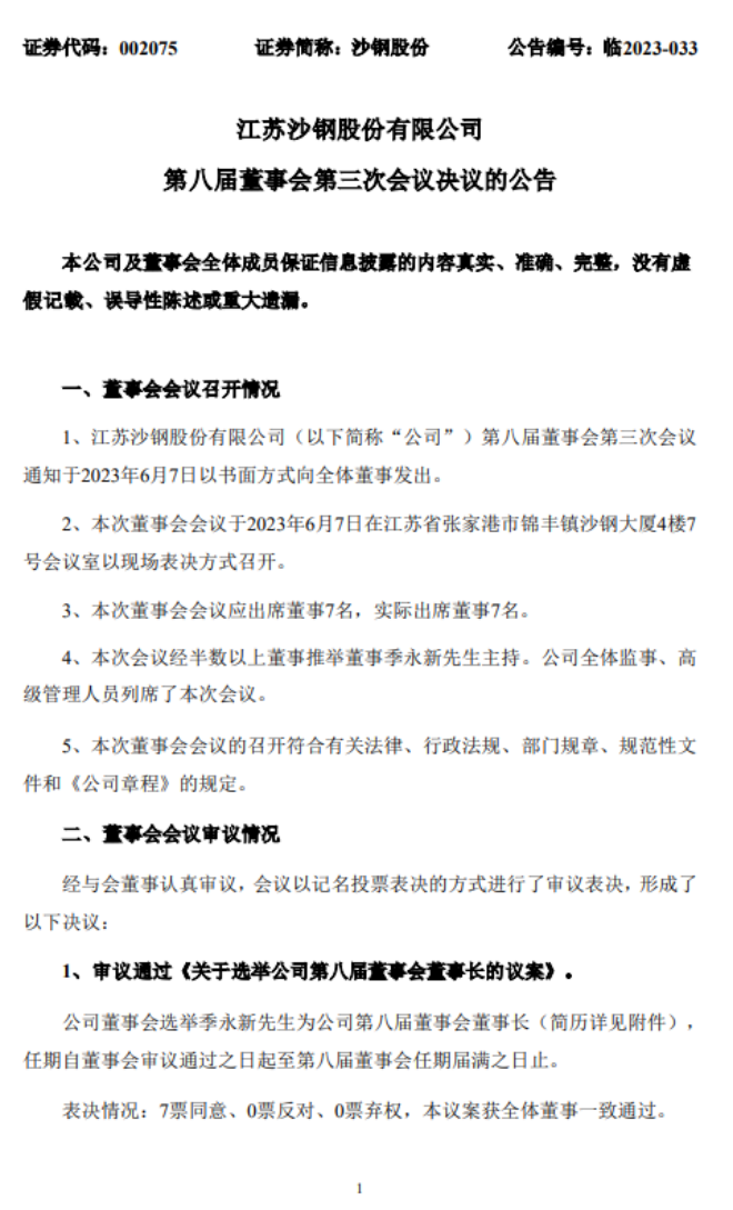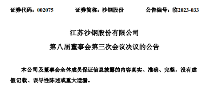 6月8日,沙鋼股份發布了《第八屆董事會第三次會議決議的公告》(以下簡稱《公告》)。
