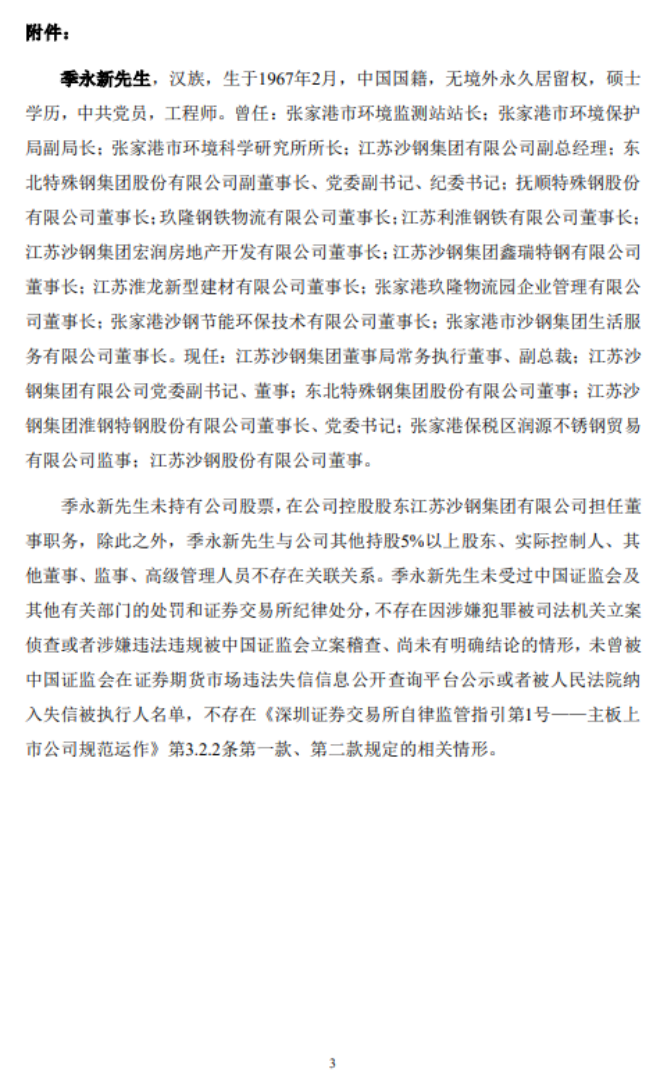 季永新先生未持有公司股票,在公司控股股東江蘇沙鋼集團有限公司擔任董事職務,除此之外,季永新先生與公司其他持股5%以上股東、實際控制人、其他董事、監事、高級管理人員不存在關聯關系。季永新先生未受過中國證監會及其他有關部門的處罰和證券交易所紀律處分,不存在因涉嫌犯罪被司法機關立案偵查或者涉嫌違法違規被中國證監會立案稽查、尚未有明確結論的情形,未曾被中國證監會在證券期貨市場違法失信信息公開查詢平臺公示或者被人民法院納入失信被執行人名單,不存在《深圳證券交易所自律監管指引第1號——主板上市公司規范運作》第3.2.2條第一款、第二款規定的相關情形。