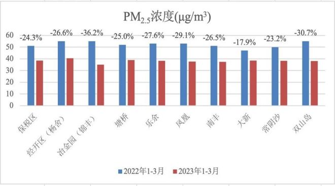 圖2 張家港市各鄉鎮2023年1-3月與2022年1-3月PM2.5平均濃度變化情況