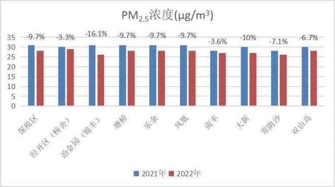 圖1 張家港市各鄉鎮2022與2021年度PM2.5平均濃度變化情況