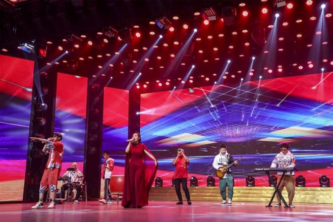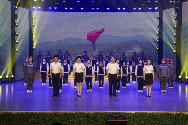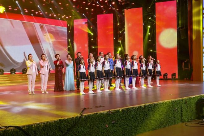 在《沒有共產黨就沒有新中國》的旋律中,全場起立,共同歌唱,呈現出一片紅色的海洋,表達著宏興兒女對黨的無限崇敬與頌揚。
