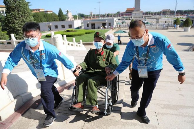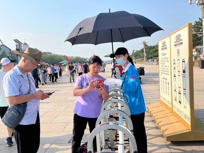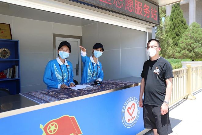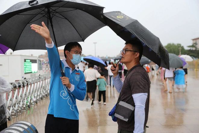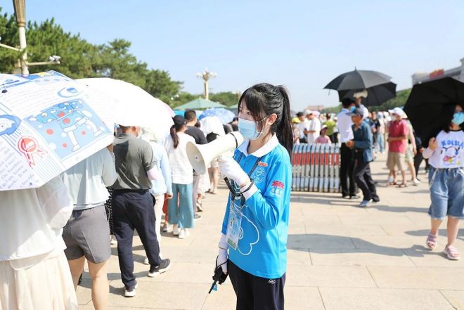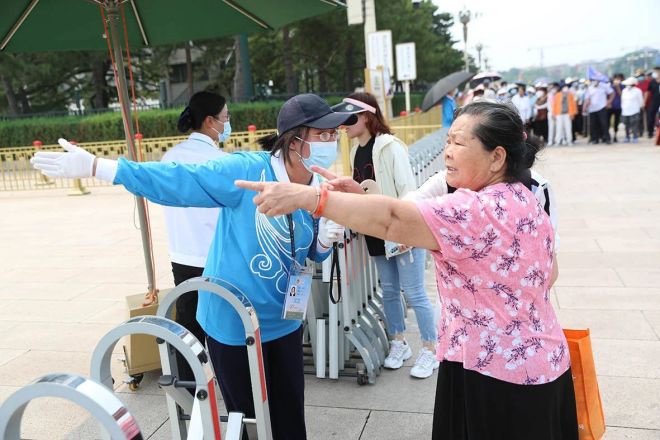 端午假期的北京持續(xù)高溫,中午天安門廣場地區(qū)的溫度達到了41度以上,體感溫度更是達到47度以上,6月23日11點58分,在紀念堂東門外有一名瞻仰群眾出現(xiàn)中暑癥狀,癱倒在地。首鋼在崗志愿者王寧和李涵宇第一時間對其進行了救助,李涵宇迅速把中暑者攙扶到武警的遮陽傘下,王寧立即給中暑者貼了冰涼貼,并用礦泉水不斷地擦拭中暑者頭部和脖頸,用清涼油擦拭中暑者太陽穴。過程中還不斷安慰中暑者,慢慢地中暑者恢復了意識,志愿者們把中暑者交給管轄警察后才放心離開。6月25日,志愿者程昊剛剛上崗,看到一位坐著輪椅的90歲老人,想進入紀念堂瞻仰毛主席,見老人行動不方便,程昊就和北助殘崗的志愿者一起把老人的輪椅拉上了紀念堂高臺,為了輪椅不打滑,程昊還主動摘掉了手套。做這樣的小事,就是志愿者每天的日常。