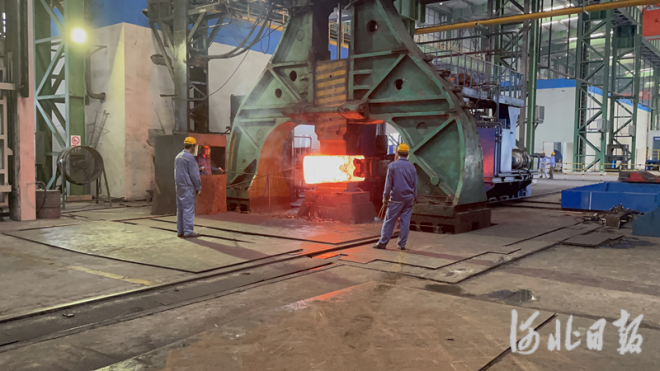 8月4日,河鋼集團(tuán)張宣高科科技有限公司特材研究制造產(chǎn)線上,鍛壓機(jī)對鍛件進(jìn)行錘打。河北日報(bào)客戶端記者魏雨攝
