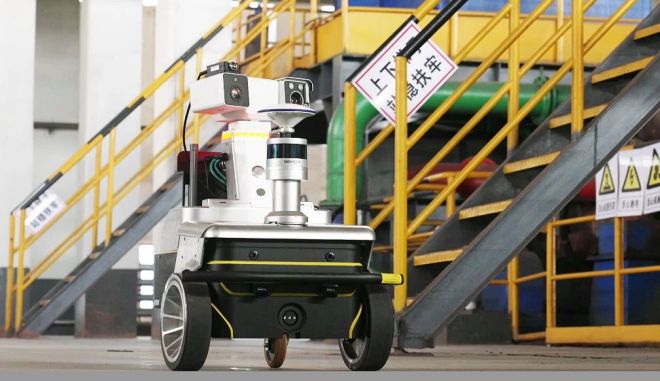 經過報備申請,記者順利通過AI智能人臉識別安全門禁系統,走進該公司磨磁區域。無燈的作業環境中,記者沿著安全通道,走上樓梯,鐵臺階上的燈帶伴隨著腳步聲被次第“喚醒”點亮。登上寬闊的作業平臺,這里與傳統車間人員忙碌的景象不同,偌大的生產現場空無一人,只有兩臺大型球磨機在快速運轉,智能巡檢機器人和清掃機器人閃爍著燈光在各處有序作業……