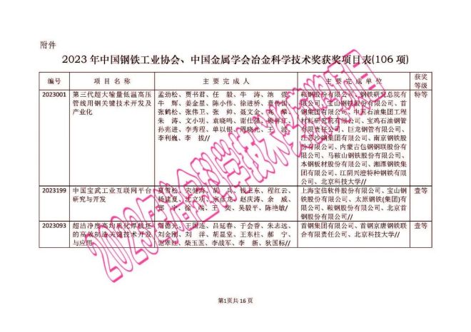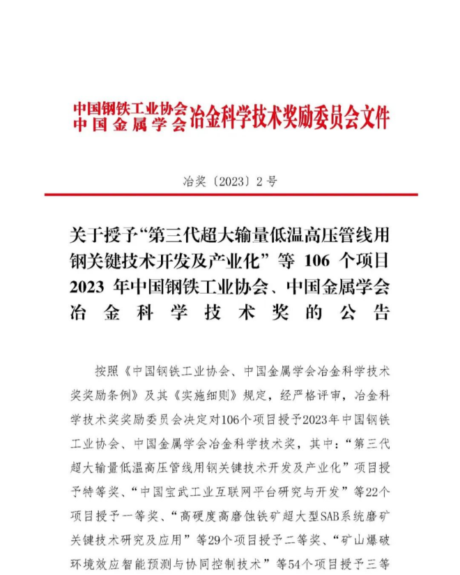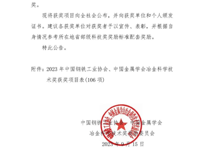 9月18日,中國鋼鐵工業協會、中國金屬學會冶金科學技術獎勵委員會正式公告了2023年冶金科學技術獎獲獎名單。建龍集團共斬獲5個獎項——一等獎、二等獎各1項,三等獎3項,牽頭項目獲獎數量位列行業第四,在民營鋼鐵企業中位居第一,獲獎數量和等級實現了歷史雙突破!