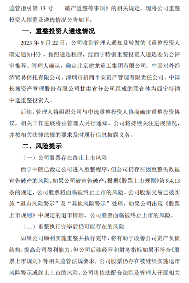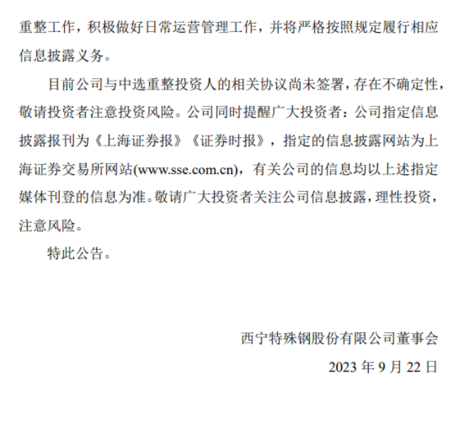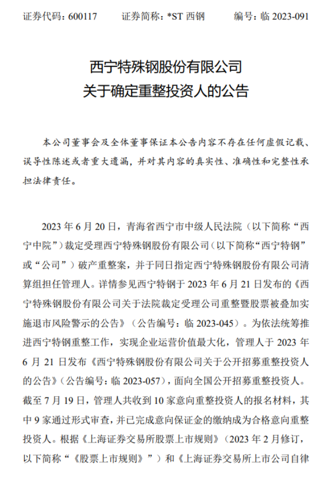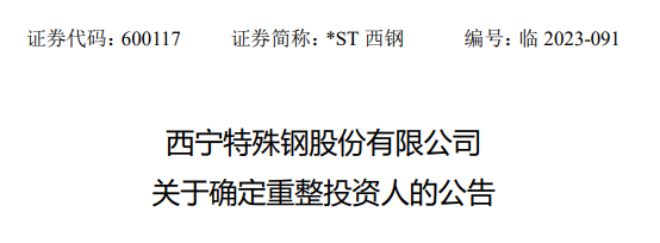 9月23日,西寧特鋼發(fā)布了《西寧特殊鋼股份有限公司關(guān)于確定重整投資人的公告》(以下簡(jiǎn)稱《公告》)。