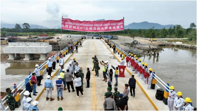 2022年9月10日,由印尼德龍工業園為北莫洛瓦里修建的、投資1500萬元的龍躍大橋正式通車。大橋全長87.15米,建成后使北莫洛瓦里縣礦山周邊居民出行更加方便快捷,突破了當地員工與公司、公司與礦山兩地間交通運輸的最后一個“瓶頸”。圖為大橋通車儀式現場。