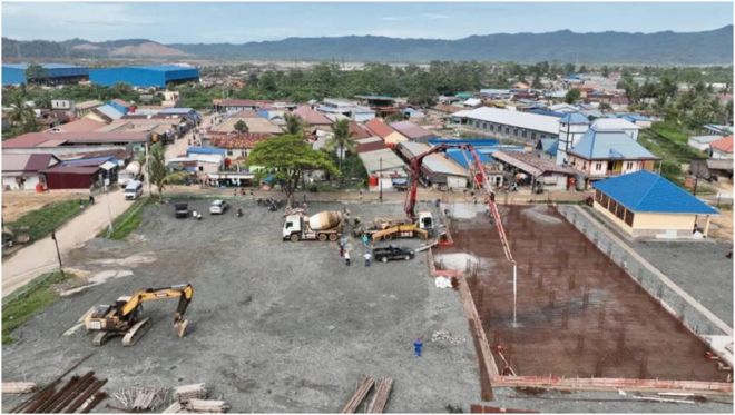 2022年11月,印尼德龍工業園決定為莫羅西鎮(Morosi)捐贈1座希望小學。設計方案中,希望小學為現代簡約風格,占地約4500平方米,共有20間教室,可輕松容納600名學生,預計投入達88億印尼盾(400萬人民幣)。學校主體框架是現澆鋼筋混凝土結構,抗震設防烈度達到8度,能夠很好地保證師生安全。這是一個“交鑰匙”工程,印尼德龍工業園將完成學校主體建設和室內裝修,配備齊全的課桌、教具、體育設施和體育器材,交付之日即可投入使用。圖為希望小學筑基施工階段。