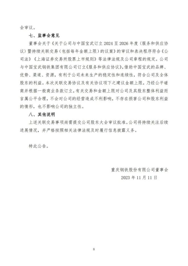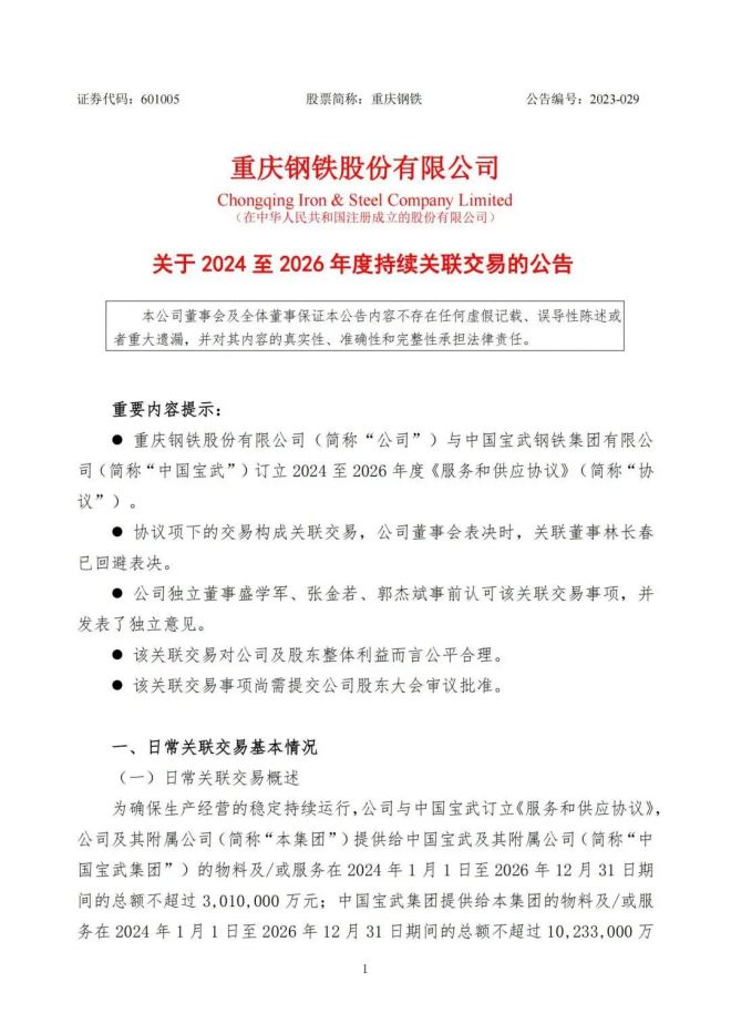 重慶鋼鐵11月10日晚間公告,為確保生產經營的穩定持續運行,重慶鋼鐵(以下簡稱公司)與中國寶武鋼鐵集團有限公司訂立《服務和供應協議》, 公司及其附屬公司提供給中國寶武及其附屬公司的物料及/或服務在2024年1月1日至2026年12月31日期間的總額不超過301億元;同期寶武集團提供給公司的物料及/或服務的總額不超過1023.30億元。