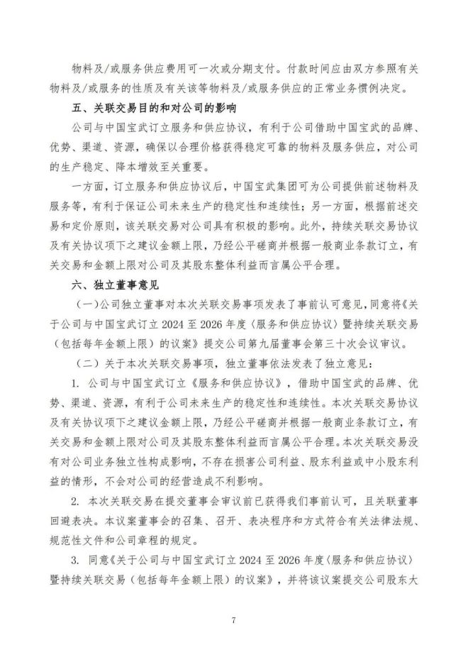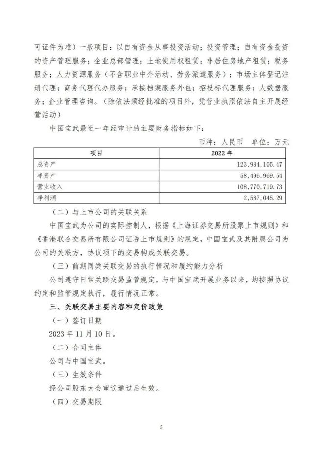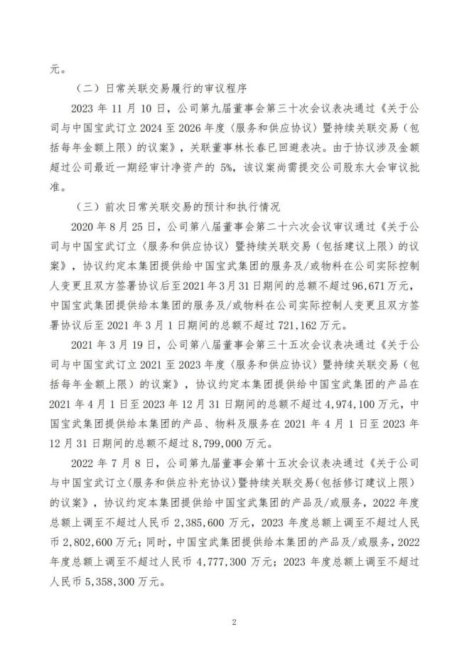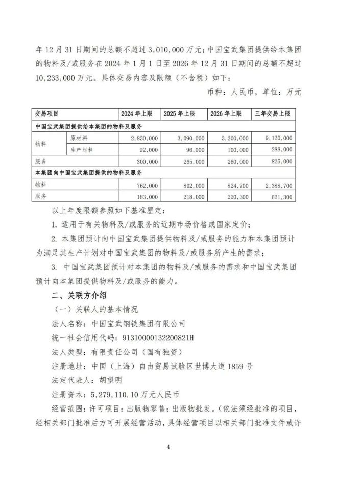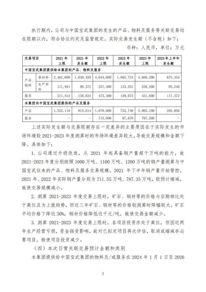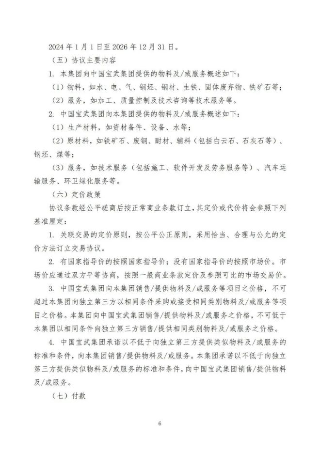 根據協議,公司向中國寶武提供的物料包括水、電、氣、鋼坯、鋼材、生鐵、固體廢棄物、鐵礦石等;服務包括加工、質量控制及技術咨詢等技術服務等。中國寶武向公司提供的生產材料包括資材備件、設備、水等;原材料包括鐵礦石、廢鋼、耐材、輔料(包括白云石、石灰石等)、鋼坯、煤等;服務包括施工、軟件開發及勞務服務、汽車運輸、環衛綠化等。雙方還約定了交易定價原則。該關聯交易對公司及其股東整體利益而言屬公平合理,并具有積極的影響。