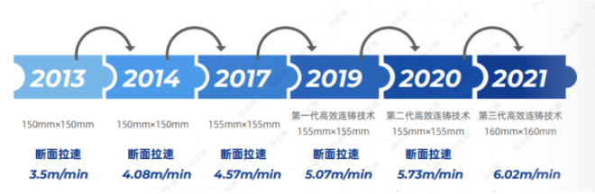 中冶南方連鑄致力于小方/圓坯高效化技術(shù)研發(fā)十余年,攻克多項(xiàng)行業(yè)共性難題,首創(chuàng)性開(kāi)發(fā)出均勻強(qiáng)冷結(jié)晶器、高頻精密振動(dòng)裝置等,依托高壓強(qiáng)冷、三維傳熱控制模型等關(guān)鍵技術(shù)的升級(jí)突破與綜合應(yīng)用,創(chuàng)造了拉速?gòu)?.5m/min到6.02m/min的一個(gè)個(gè)里程碑節(jié)點(diǎn)的跨越,實(shí)現(xiàn)了國(guó)內(nèi)小方坯最高拉速記錄,躋身世界一流的先進(jìn)水平。