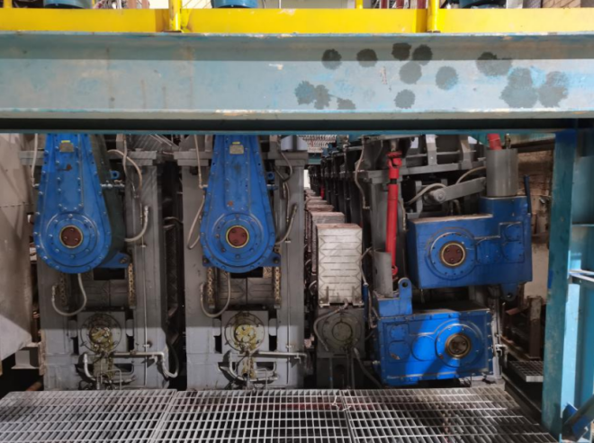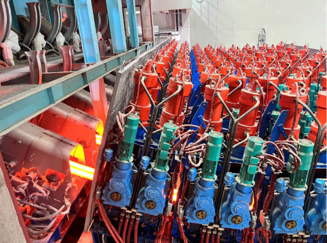 在柳鋼防城港項(xiàng)目的基礎(chǔ)上,采用柔性引錠桿型式,空出矯直區(qū)拉矯機(jī)后空間,布置5臺(tái)獨(dú)立壓下的重壓下機(jī)架,實(shí)現(xiàn)品種鋼更高拉速技術(shù)開(kāi)發(fā)的首次嘗試,目標(biāo)為高碳硬線鋼拉速突破3.5m/min,達(dá)到國(guó)際領(lǐng)先水平,目前拉速已突破3.2m/min(國(guó)內(nèi)常規(guī)約1.8~2.2m/min)。