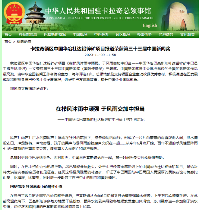 第33屆中國新聞獎評選結果近日揭曉,中國五礦所屬中國華冶作品《在櫛風沐雨中頑強 于風雨交加中擔當——中國華冶巴基斯坦杜達鉛鋅礦中巴員工攜手抗洪記》榮獲國際傳播類三等獎,這是中國五礦首次獲此殊榮,也是這項國家新聞作品最高獎對中國五礦踐行央企國際傳播使命,積極探索講好中國故事、傳播好中國聲音的激勵和褒獎。