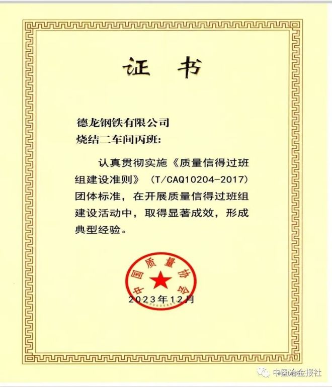 2023年以來,德龍鋼鐵通過運用先進適用的質量管理方法和質量標準規范,強化班組建設、推廣質量活動、完善管理模式,打造了行業內“質量標桿”。該公司燒結廠上下齊心,依托《質量信得過班組評價準則》,轟轟烈烈地開展“質量信得過班組”建設活動。其中,燒二車間丙班以“煉鐵的需求就是燒結的追求”為宗旨,以“控制白灰月波動次數”為目標,以工藝操作規程和關鍵工序控制點作為測量指標,通過規范班組工作流程、推行“222”人才建設模式、開展QC小組活動、每周高爐走訪、完善八項管理制度等措施,提升了班組的綜合水平。該班在此次中國質量協會舉辦的全國優秀班組交流中,獲評“質量信得過班組建設典型經驗”,打造了該公司首個全國“質量信得過班組”。