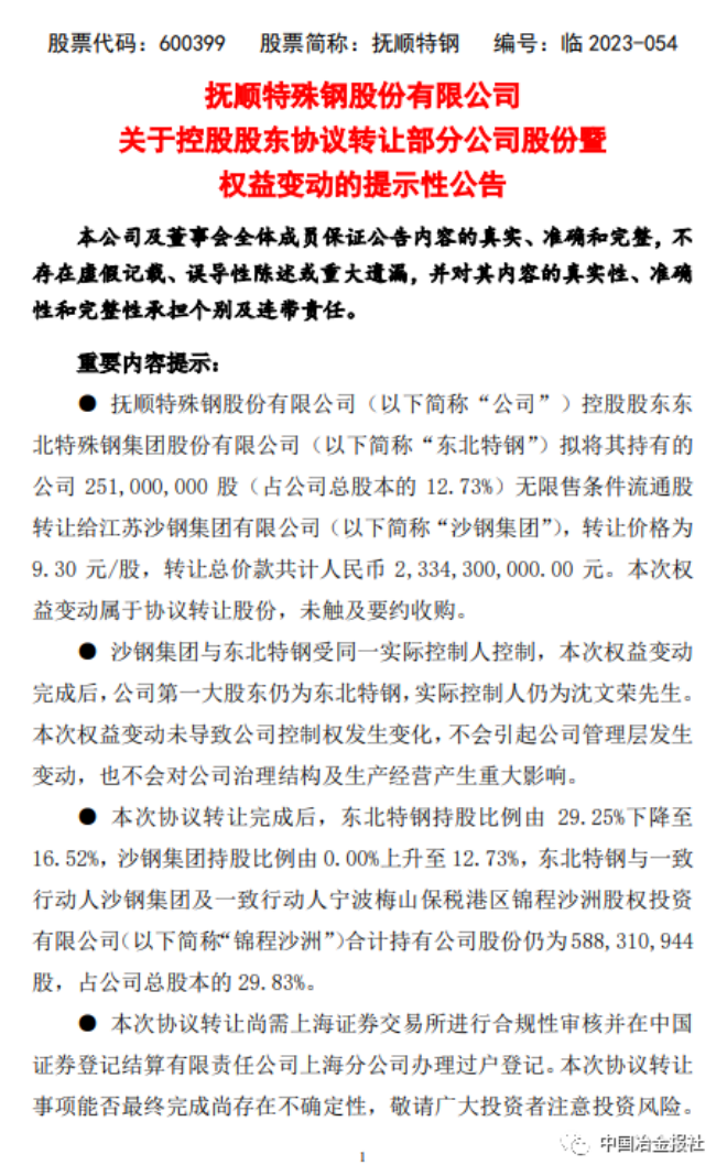 12月8日,撫順特鋼發布了《撫順特鋼:撫順特殊鋼股份有限公司簡式權益變動報告書(江蘇沙鋼集團有限公司)》公告(以下簡稱《公告》)。