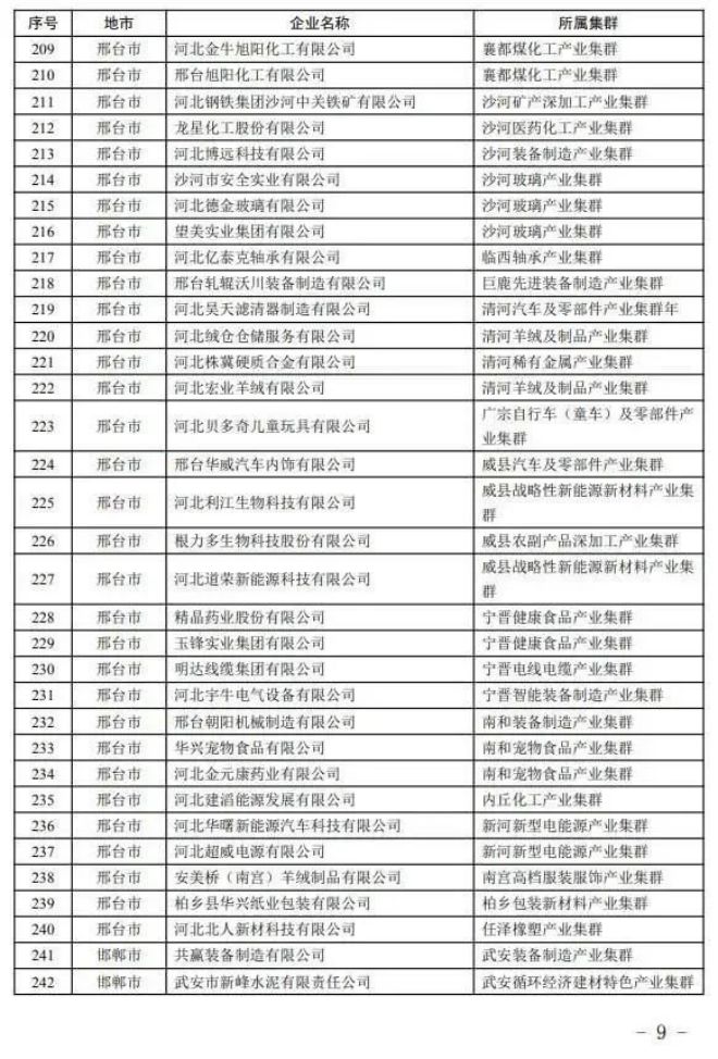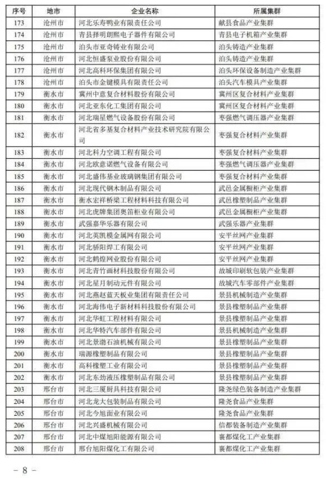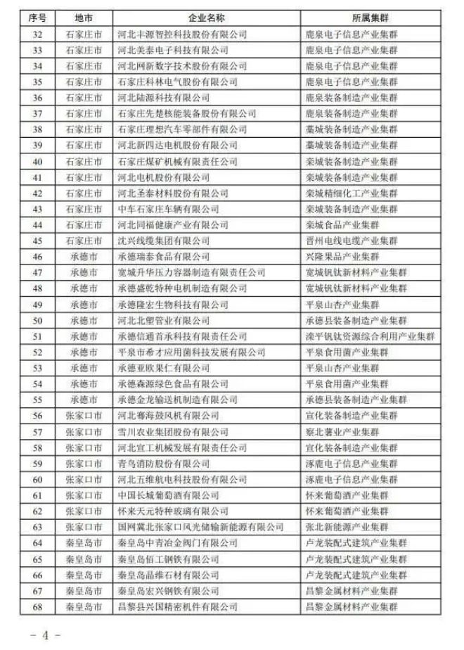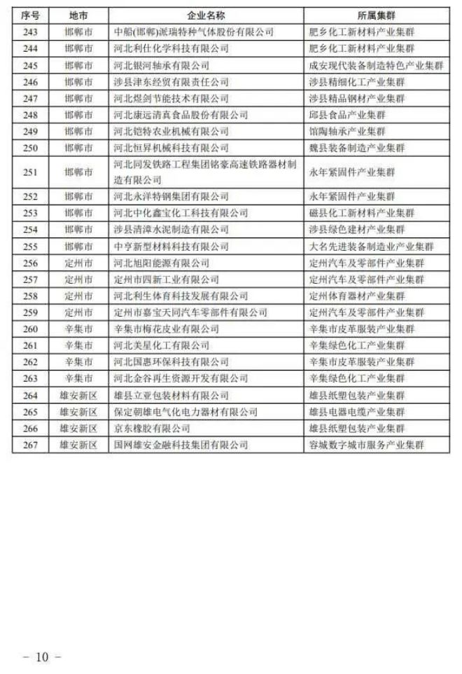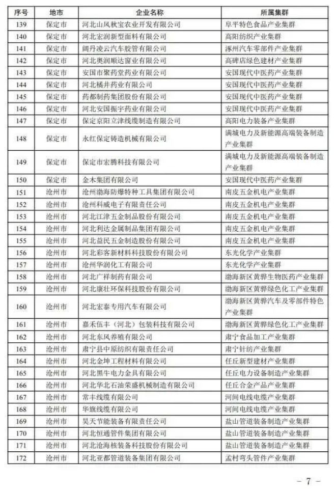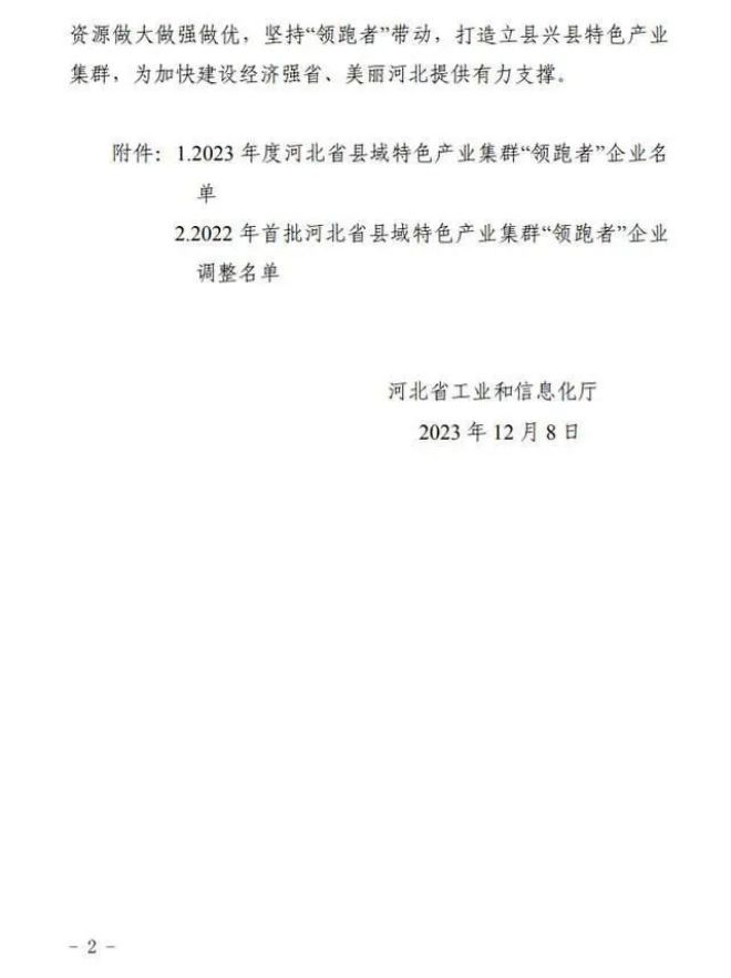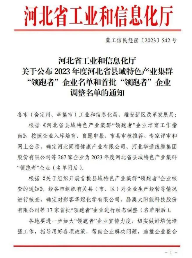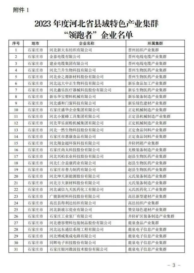 河北省工業(yè)和信息化廳12日消息:根據(jù)《河北省縣域特色產(chǎn)業(yè)集群“領跑者”企業(yè)培育工作指南》,按照企業(yè)入庫培育、自愿申報、市縣審核推薦、專家評審和網(wǎng)上公示,確定河北同福健康產(chǎn)業(yè)有限公司、河北華通線纜集團股份有限公司、秦皇島佰工鋼鐵有限公司等267家企業(yè)為2023年度河北省縣域特色產(chǎn)業(yè)集群“領跑者”企業(yè)(名單附后)。