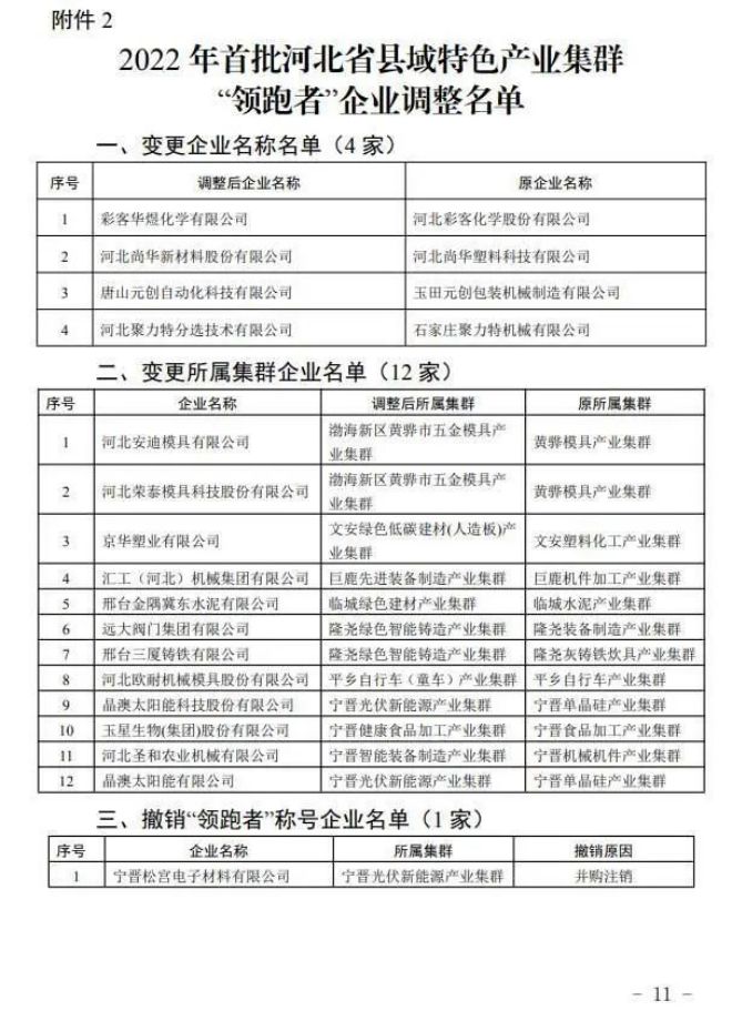 根據(jù)《關于組織開展首批縣域特色產(chǎn)業(yè)集群“領跑者”企業(yè)核查的通知》,經(jīng)各市組織有關縣(市、區(qū))對企業(yè)生產(chǎn)經(jīng)營等情況進行核查,確定對彩客華煜化學有限公司、晶澳太陽能科技股份有限公司等17家首批“領跑者”企業(yè)進行動態(tài)調整(名單附后)。