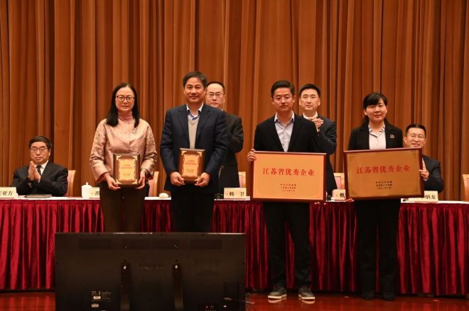 會議表彰了2023年度獲得國家級榮譽的企業和江蘇省優秀企業,永鋼獲頒“江蘇省優秀企業”和“張家港市新型工業化領航企業獎”榮譽獎牌,永鋼集團總裁吳毅、永鋼集團副總裁程勇分別上臺領獎。