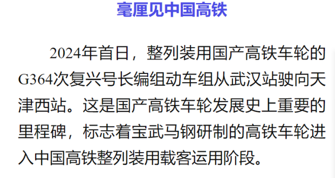 2024年首日,整列裝用國產(chǎn)高鐵車輪的G364次復興號長編組動車組從武漢站駛向天津西站。這是國產(chǎn)高鐵車輪發(fā)展史上重要的里程碑,標志著寶武馬鋼研制的高鐵車輪進入中國高鐵整列裝用載客運用階段。