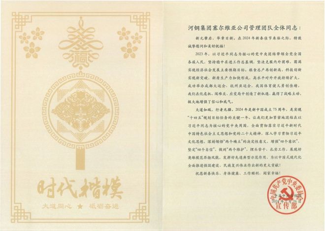 新元肇啟,華章日新。在2024年新春佳節(jié)來臨之際,中共中央宣傳部特向“時代楷模”河鋼塞鋼管理團隊發(fā)來新春慰問信,致以誠摯慰問和美好祝福。
