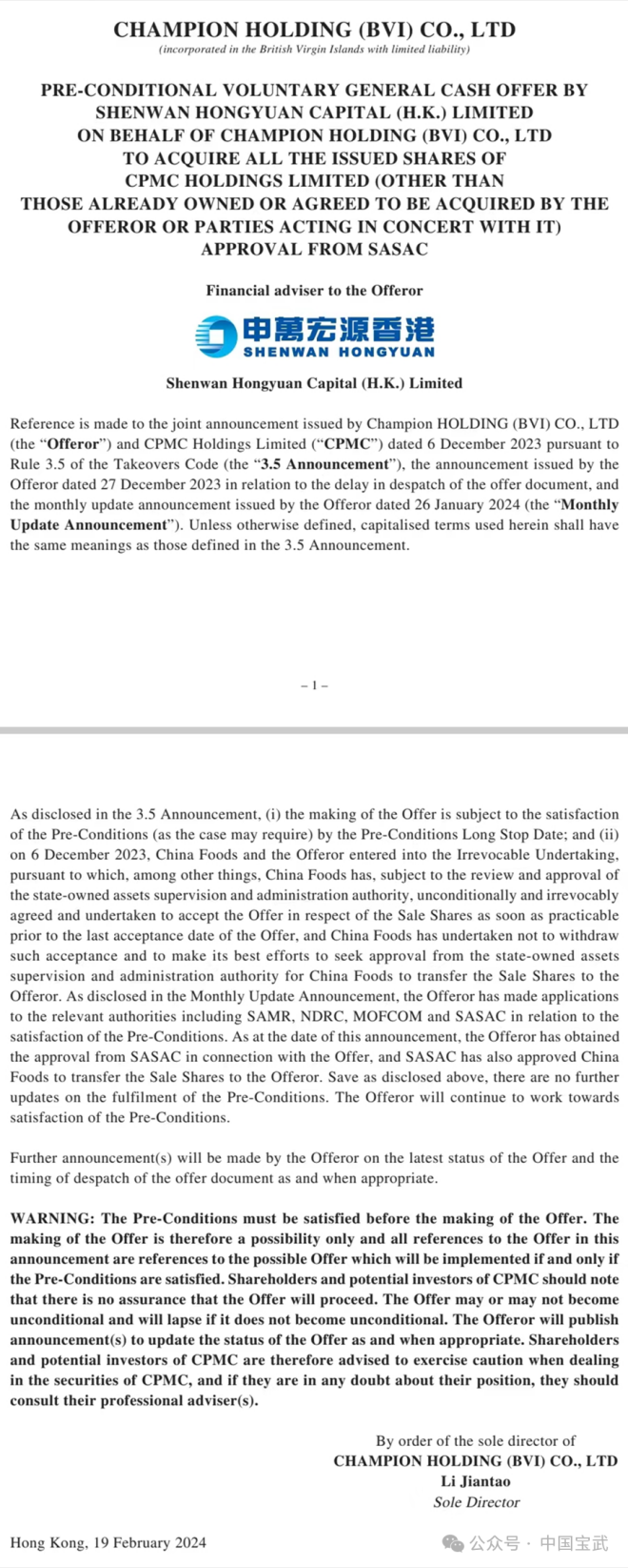 近日,國務院國資委批復同意由中國寶武聯(lián)合國新投資有限公司(下稱“國新投資”)對中糧包裝股份有限公司(0906.HK,下稱“中糧包裝”)發(fā)起的自愿全面現(xiàn)金要約收購,同步也批準了中糧集團下屬中國食品(控股)有限公司將其所持有的中糧包裝33065.88萬股股份(股權(quán)比例29.7%)轉(zhuǎn)讓給中國寶武與國新投資聯(lián)合成立的境外要約主體Champion HOLDING (BVI) CO., LTD。