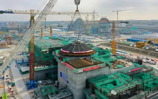 圖為中核集團 “玲龍一號”外穹頂?shù)跹b現(xiàn)場。