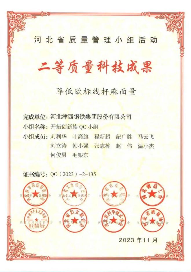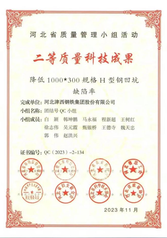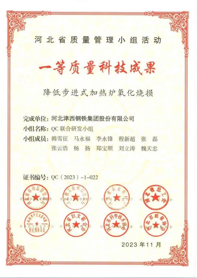 此前,河北省質(zhì)量協(xié)會通報的2023年度質(zhì)量管理小組活動質(zhì)量科技成果名單中,津西《降低步進式加熱爐氧化燒損》獲一等質(zhì)量成果;《降低歐標線桿麻面量》、《降低1000*300規(guī)格H型鋼凹坑缺陷率》兩項獲二等質(zhì)量成果。