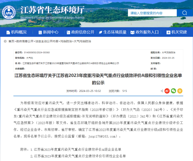 為積極有效應對重污染天氣,進一步突出精準治污、科學治污、依法治污,保障人民群眾身體健康,根據《重污染天氣重點行業應急減排措施制定技術指南(2020年修訂版)》(環辦大氣函〔2020〕340號)、《關于印發<重污染天氣重點行業績效分級及減排措施>補充說明的通知》(環辦便函〔2021〕341號)和《江蘇省重污染天氣應急預案》(2023年版)等文件,江蘇省生態環境廳組織各地開展2023年度重污染天氣重點行業績效分級評價工作,經過企業自評、市局初審、省廳審核,確定了江蘇省2023年度重污染天氣重點行業績效分級A級和引領性企業名單。