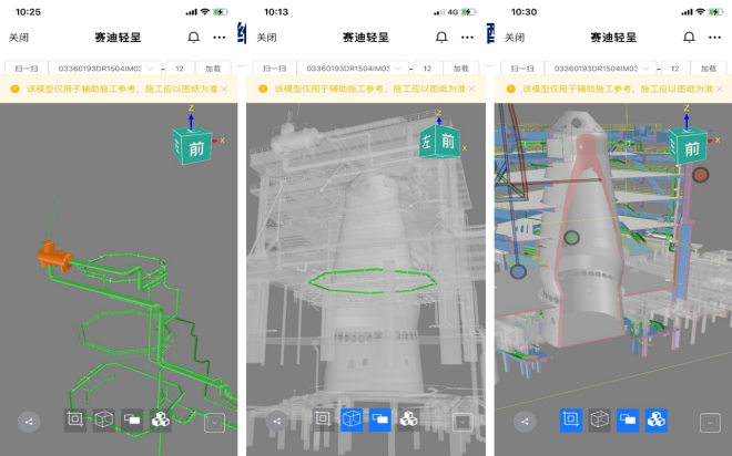 “賽迪輕呈”平臺的多項功能已在福建三鋼本部高爐、陜西漢鋼中厚板、四川達鋼煉鋼等幾十個項目中普及應用,有效解決了二維圖紙讀圖困難、應用舊版圖紙引起施工質量問題、項目各方遠程了解現場情況難等問題,獲得普遍好評。