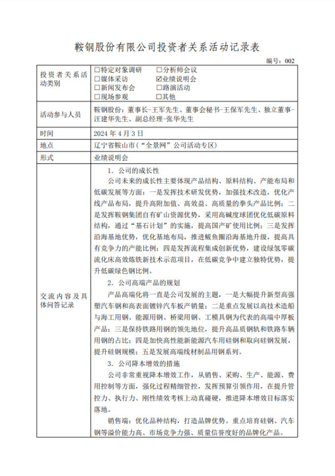 鞍鋼股份有限公司未來的成長性主要體現在產品結構、原料結構、產能布局和低碳發展等方面:一是發揮技術研發優勢,加強技術改造,優化產線產品布局,提升高附加值、高效益、高質量的拳頭產品比例;二是發揮鞍鋼集團自有礦山資源優勢,采用高堿度球團優化低碳原料結構,提高國產礦使用比例;三是發揮沿海基地優勢,優化基地布局,推進鲅魚圈沿海基地升級,提高具有競爭力的產能比例;四是發揮流程集成創新優勢,建設綠氫零碳流化床高效煉鐵新技術示范項目,在低碳競爭中建立獨特優勢,提升低碳綠色鋼比例。