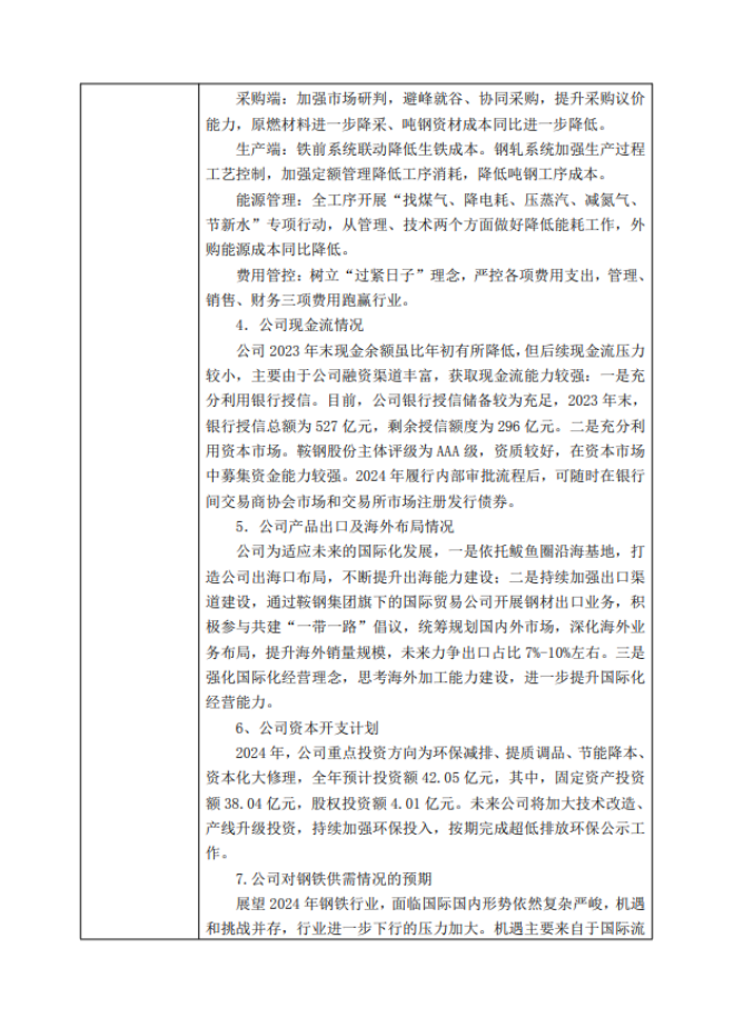 鞍鋼股份有限公司為適應未來的國際化發展,一是依托鲅魚圈沿海基地,打造公司出海口布局,不斷提升出海能力建設;二是持續加強出口渠道建設,通過鞍鋼集團旗下的國際貿易公司開展鋼材出口業務,積極參與共建“一帶一路”倡議,統籌規劃國內外市場,深化海外業務布局,提升海外銷量規模,未來力爭出口占比7%-10%左右。三是強化國際化經營理念,思考海外加工能力建設,進一步提升國際化經營能力。