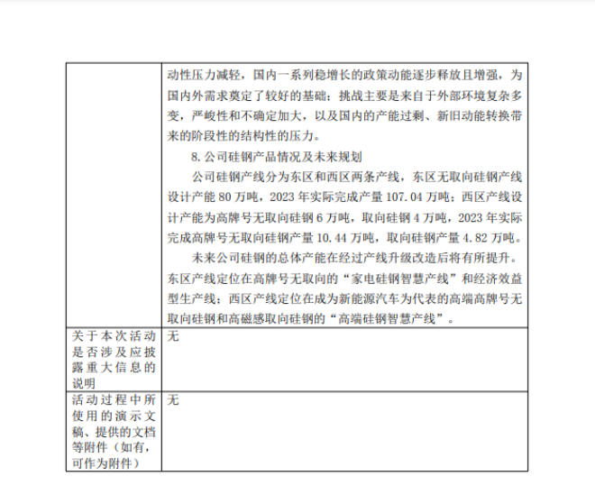 鞍鋼股份有限公司硅鋼產線分為東區和西區兩條產線,東區無取向硅鋼產線設計產能80萬噸,2023年實際完成產量107.04萬噸;西區產線設計產能為高牌號無取向硅鋼6萬噸,取向硅鋼4萬噸,2023年實際完成高牌號無取向硅鋼產量10.44萬噸,取向硅鋼產量4.82萬噸。